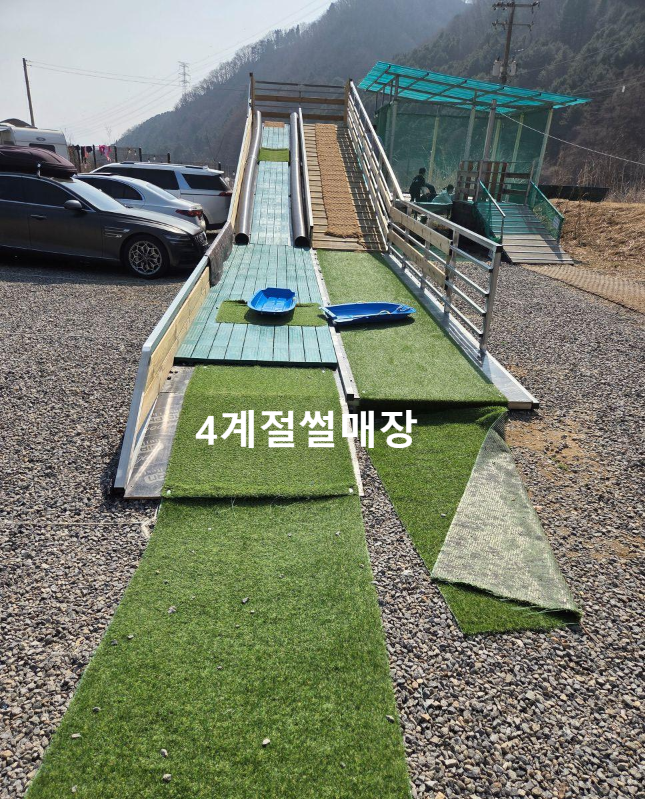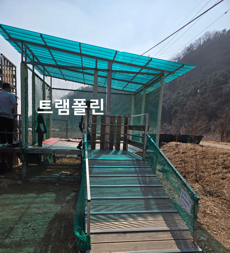 놀이터에는 4계절썰매, 트램폴린, 짚라인, 그네 이렇게 4가지가 있어요. 작지만 알찬 구성으로 아아들이 텐트로 돌아오지 않는 그런 놀이시설이^^ 그래도 7살 이하는 엄빠중 한명은 지켜봐야겠죠?
