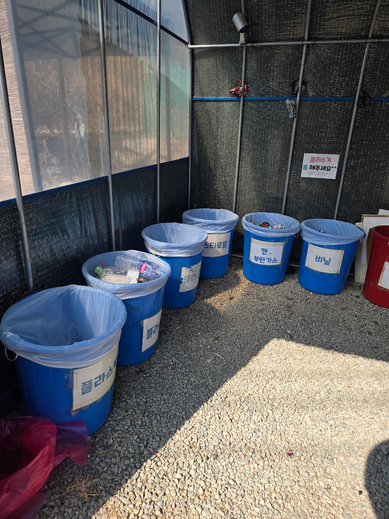 캠핑장 입구 들어와서 왼쪽에 바로 흡연장이랑 분리수거장이 있어요. 시간정해서 청소하시는지 갈때마다 깔끔하더라구요. 흡연장 꽁초버리는 통도, 분리수거통들도 꺠끗해요.