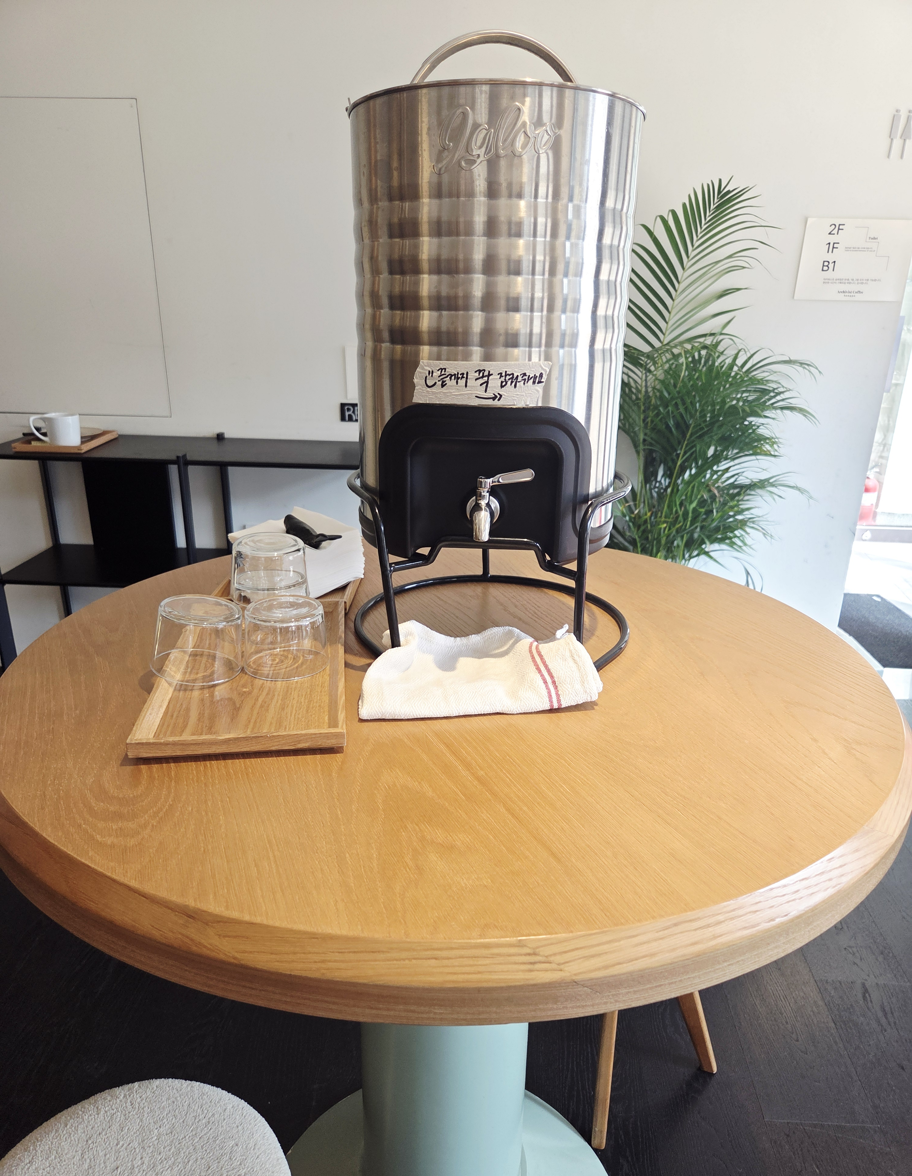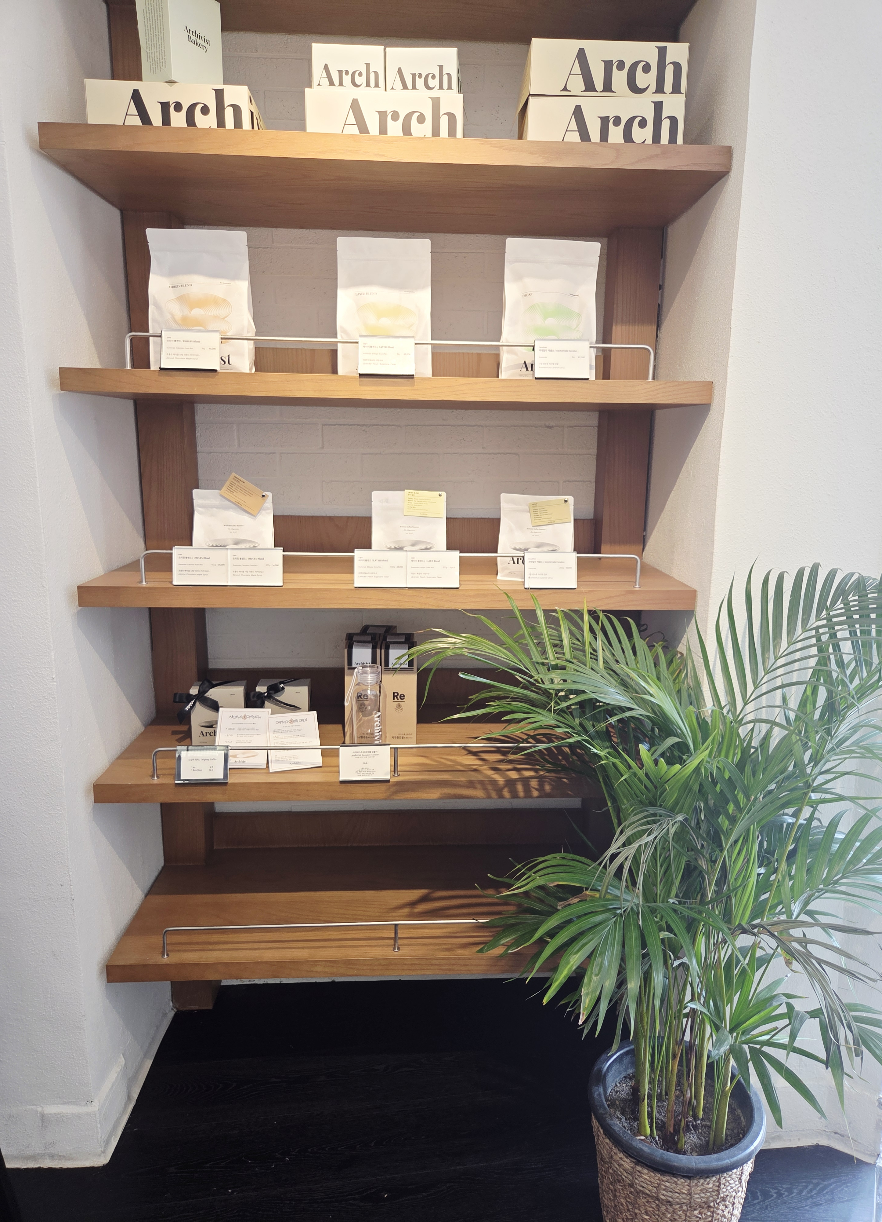 내부 인테리어는 건물 외부와 어울리게 모던 그 자체였어요. 초록 큰 화분도 군데군데 보이고, 카페에서 직접 볶은 커피원두를 판매하는 판매대가 보이네요.