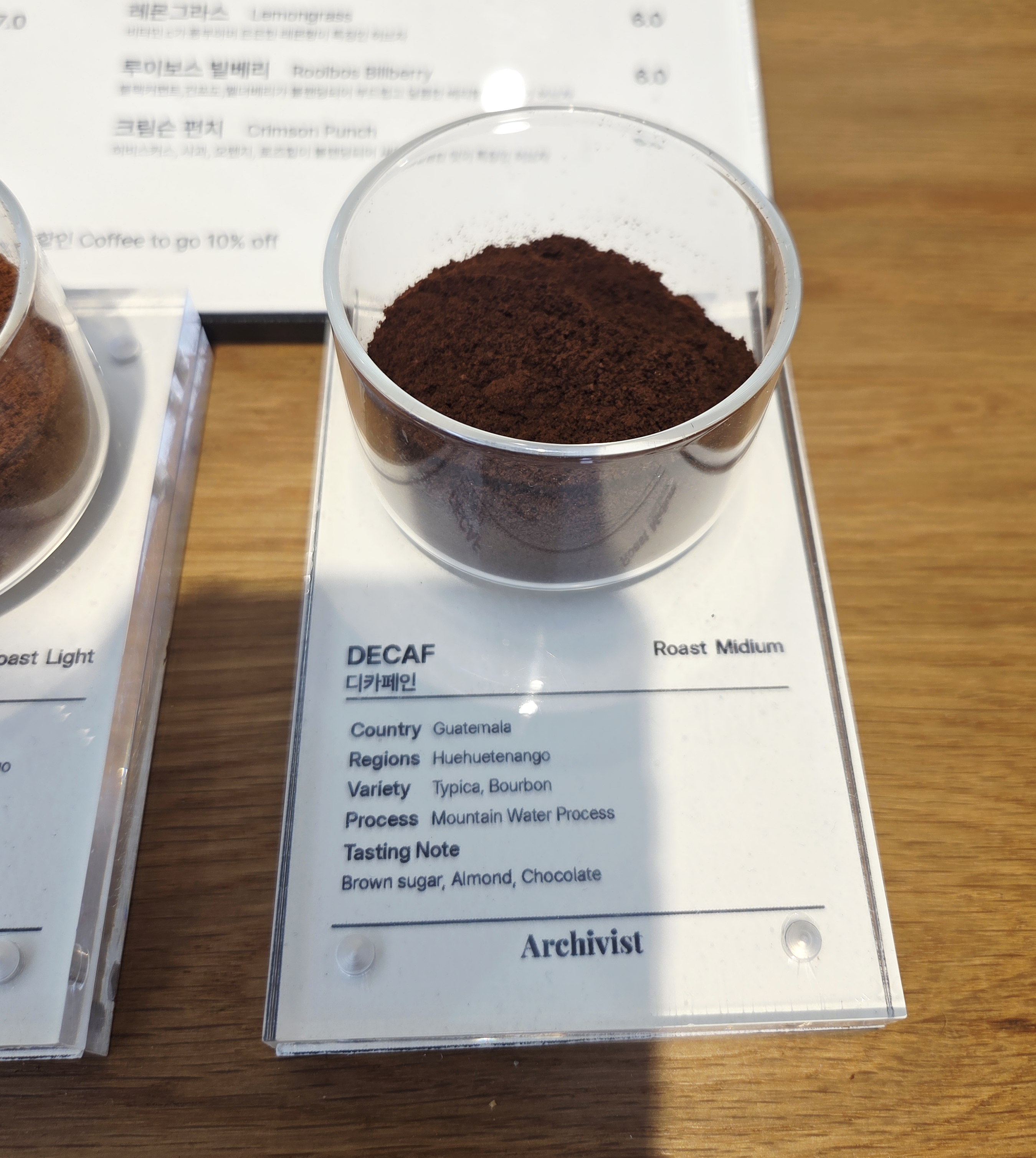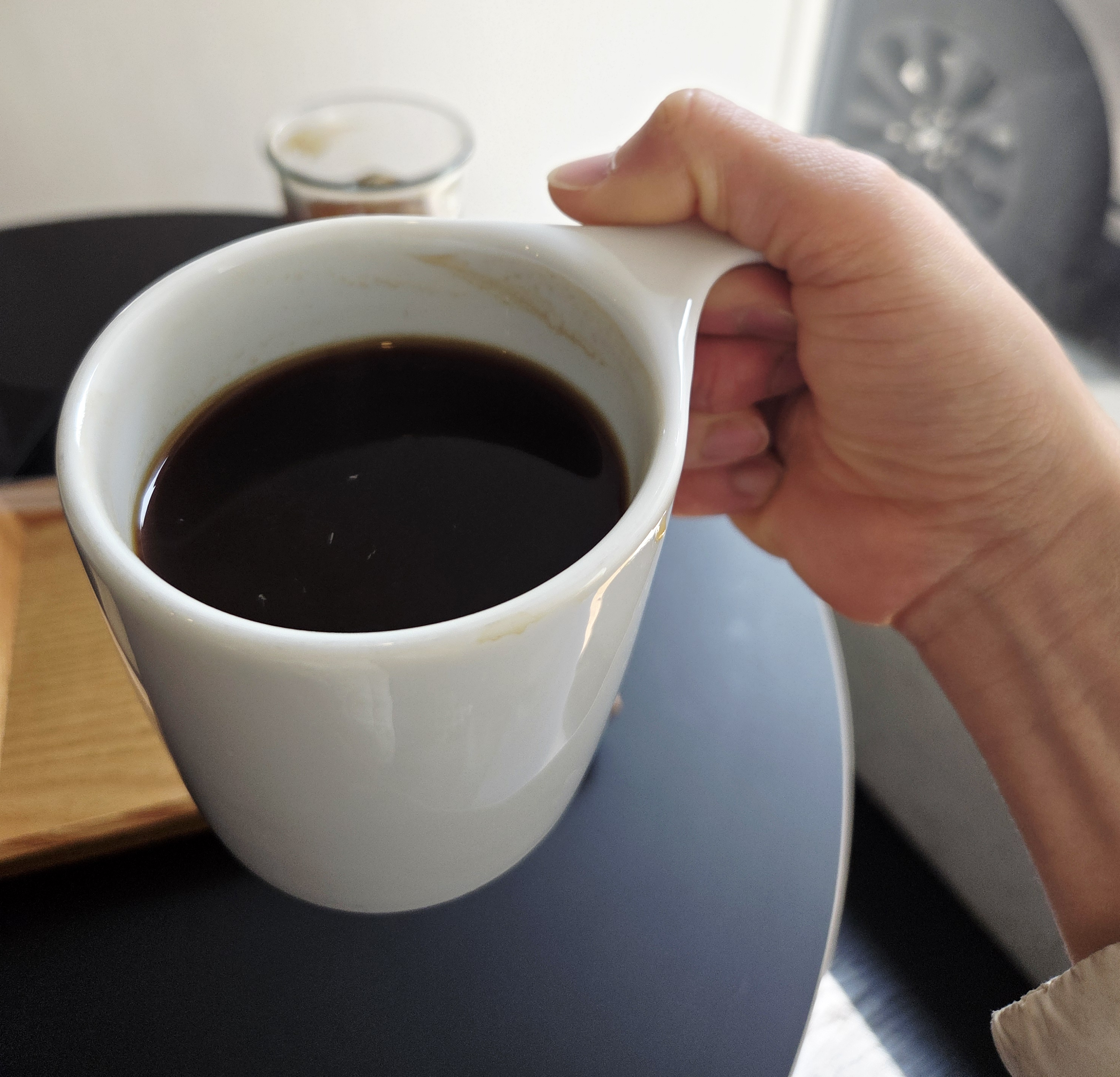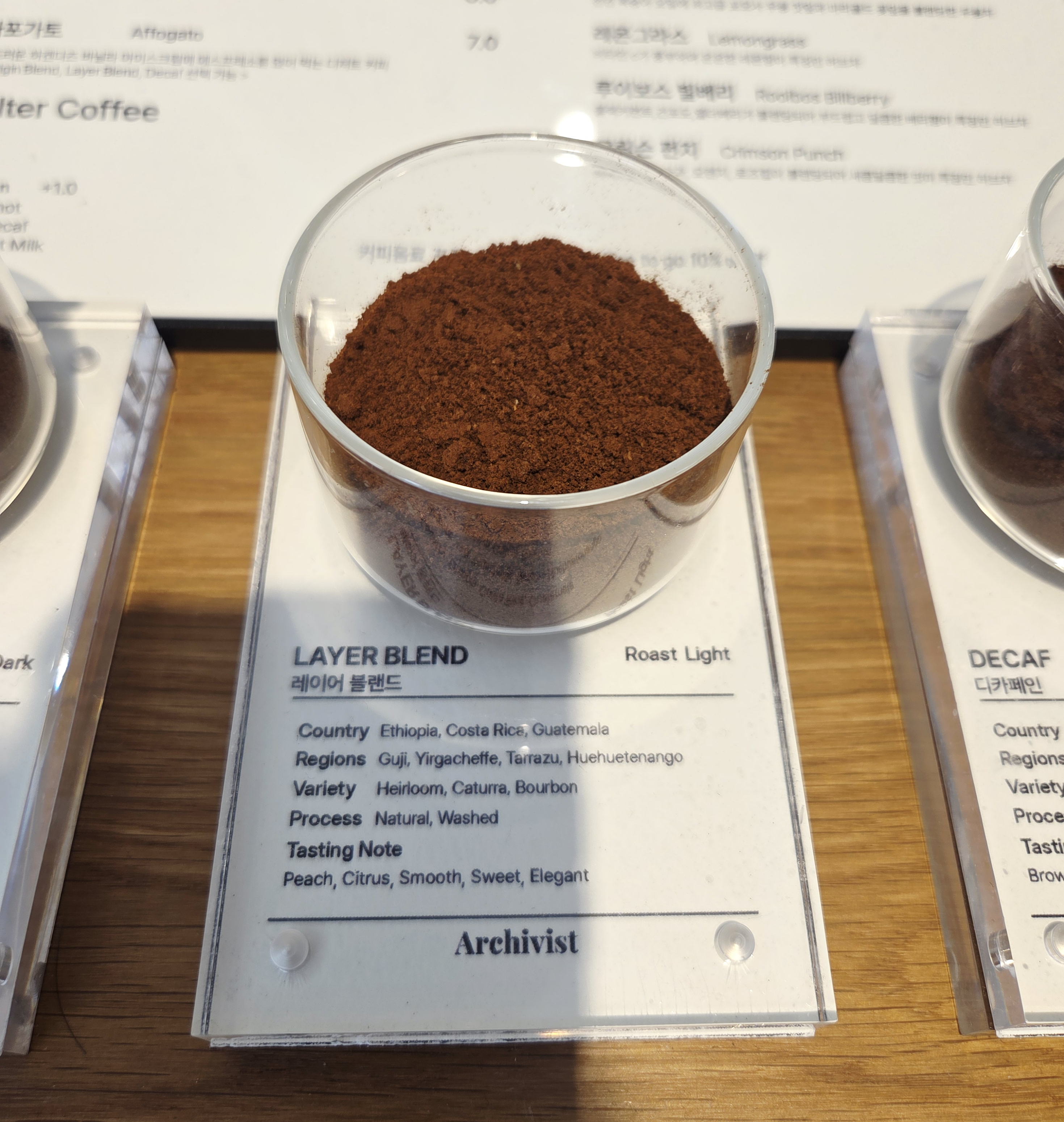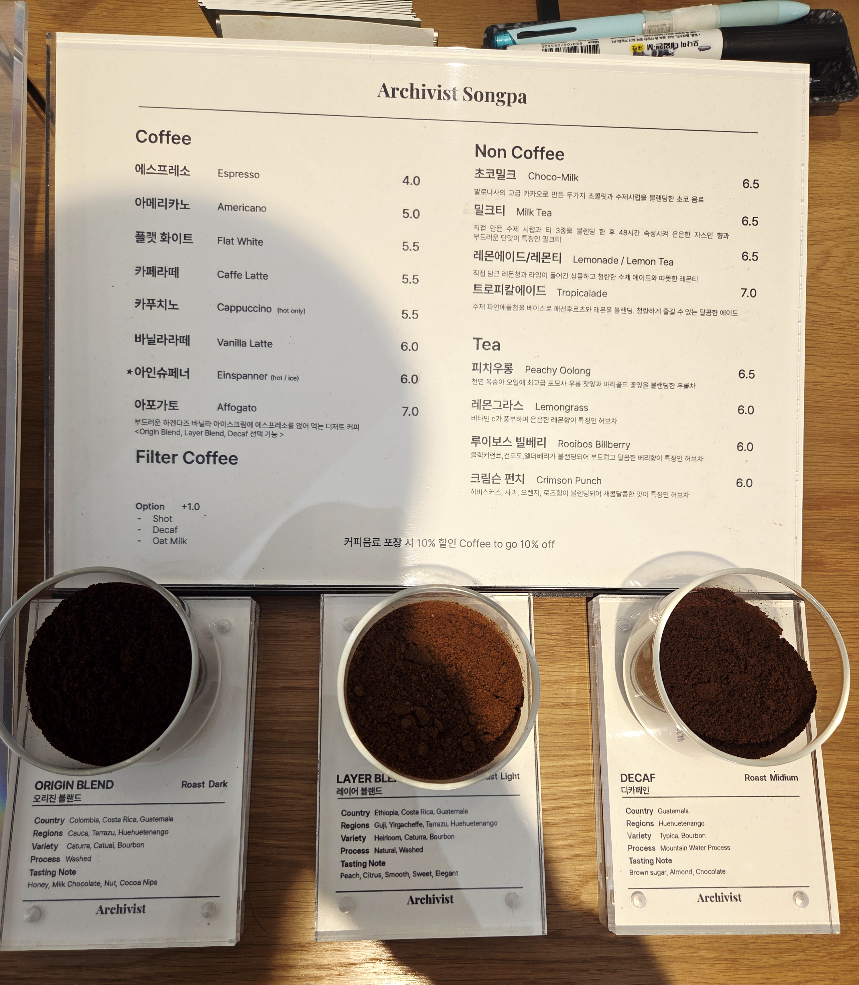 고소한맛(Origin blend) , 산미있는거(Layer blend), 디카페인(Decaf) 이렇게 3가지가 있어서 임산부나 카페인에 약한 사람들도 커피를 즐길 수 있는 카페예요. 가격도 송리단길 한복판에 이정도면 착하죠? 저는 고소한 원두를 좋아해서 오리진블렌드(Origin blend)를 시켰어요. 한 모금에 훅 '아 여기도 커피 좀 하네?'하는 생각이 들게하는 향이였어요.