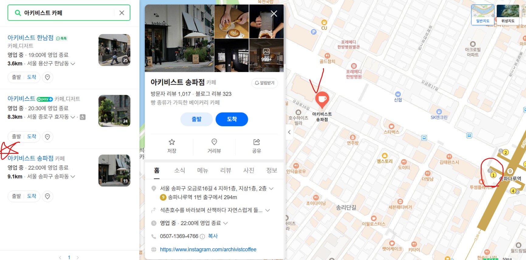 송리단길 아키비스트 카페는 송파나루역 1번출구에서 내려서 한 300m만 걸으면 바로 만날 수 있습니다.