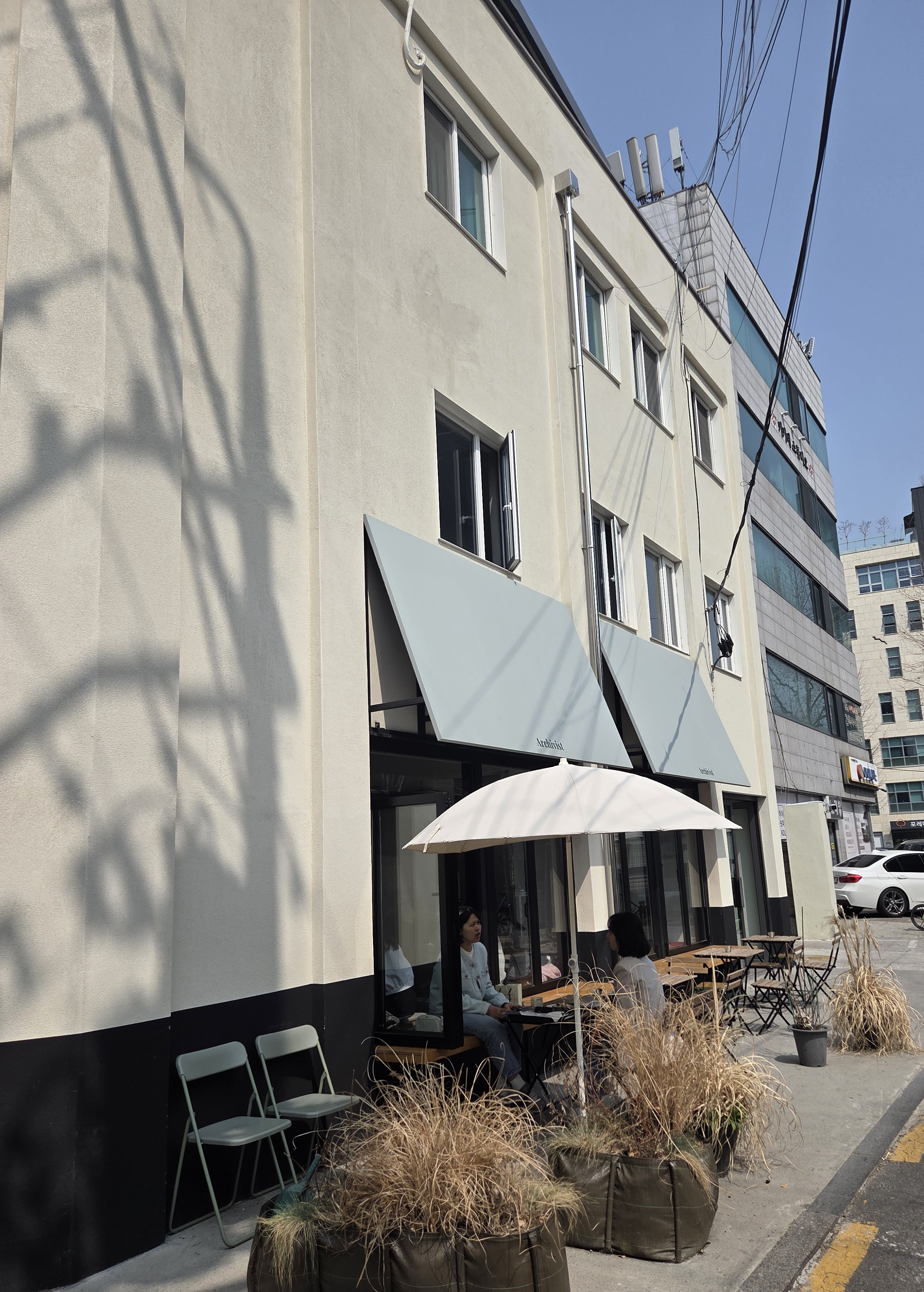 건물부터 모던하게 눈에 띄는 건물이라 커피가 필요한 타이밍이면 지나칠 수가 없는 곳이였습니다. 3월이라 날씨가 좋아서 테라스에서 햇빛받으며 점심 후 커피를 즐기는 직장인들이 보이네요.